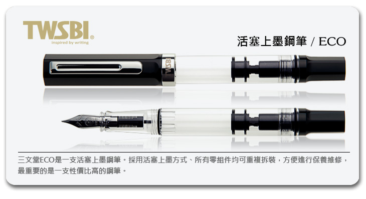 三文堂ECO是一支活塞上墨鋼筆。 採用活塞上墨方式,所有零件均可重複拆裝,方便進行保養維修,最重要的是一支性價比高的鋼筆。 ◆筆本身尺寸: 139 x 15.3 x 17.2 mm, 外盒包裝尺寸: 165 x 53 x 25 mm ◆筆本身重量: 21g, 外盒包裝重量: 85g
