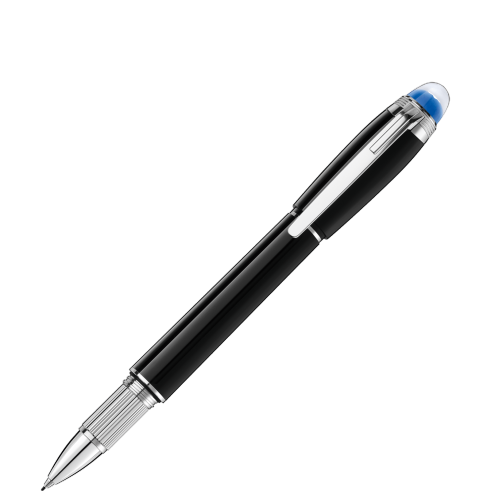 星際行者系列珍貴樹脂書寫工具配有鍍鉑金筆夾及黑色珍貴樹脂筆蓋及筆身。鋼筆配有手工製 Au585 / 14K 鍍銠金質筆尖。