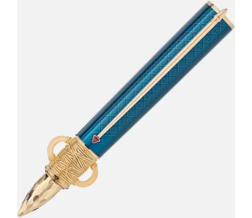 1440 年,蒙特蘇馬一世獲加冕為偉大的阿茲特克帝國國王,自此開始阿茲特克人的黃金時代。他在執政期間塑造了今天為人所熟悉的阿茲特克帝國形象——充滿文化氣息和傳奇神話的國度。首都特諾奇提特蘭,即今天的墨西哥城,在他的統治下發展蓬勃。萬寶龍藝術贊助系列向蒙特蘇馬一世致意限量版 4810 飾有香檳色鍍金質配件,向這位在世界歷史中創造獨特文化的統治者致意。整體設計靈感源自阿茲特克人用於投擲長矛的裝置——梭鏢投射器( atlatl )。圓錐體的形狀以帶有黑曜石刀片的阿茲特克祭刀為主體,並以鐵錘精細打磨而成。漆面顏色(油藍色和胭脂紅色)從王室斗篷的顏色汲取靈感。筆蓋飾有兩個象形文字,象徵蒙特蘇馬一世統治的歷史。手工精製的 Au750 實心金質筆尖飾有精美雕刻,以特諾奇蒂特蘭城市的阿茲特克圖騰為靈感:一個佩戴王冠的三葉仙人掌和兩幅卷軸。