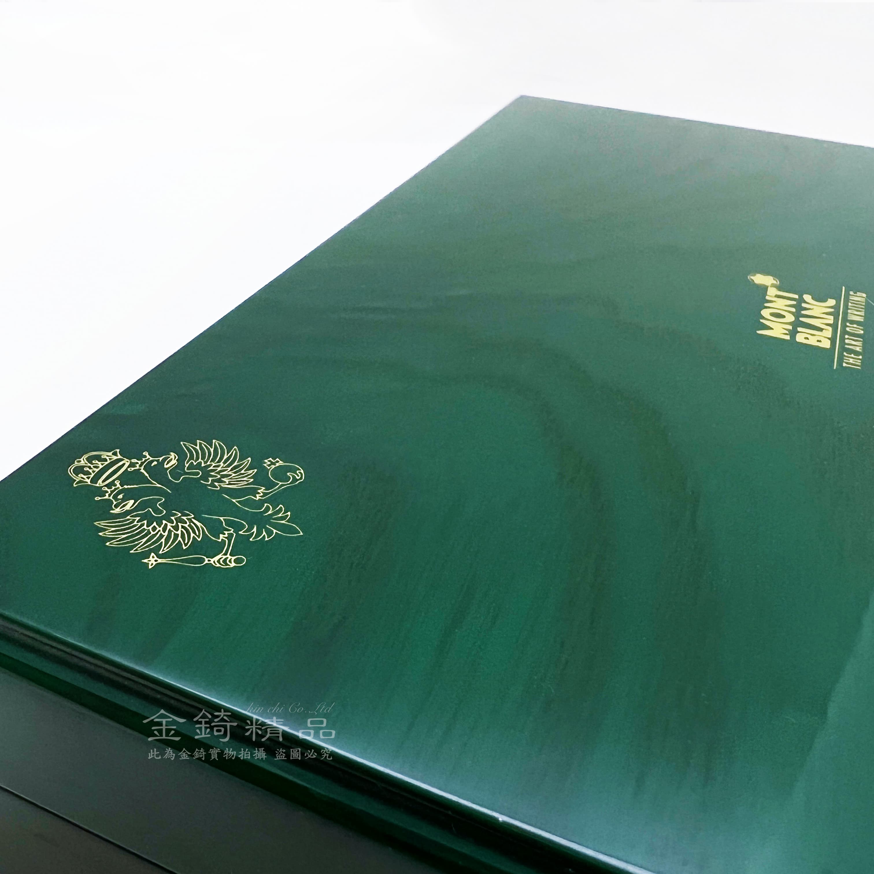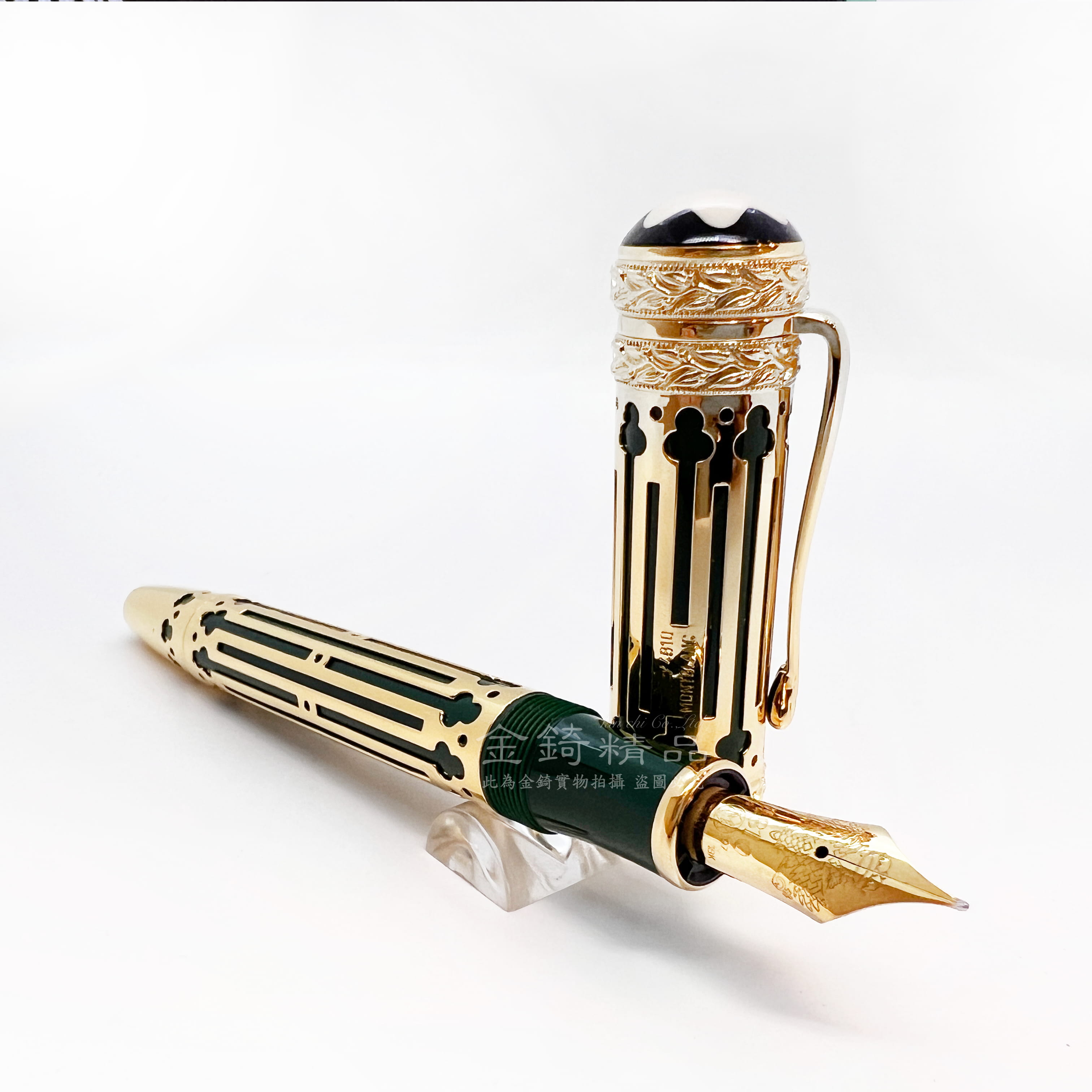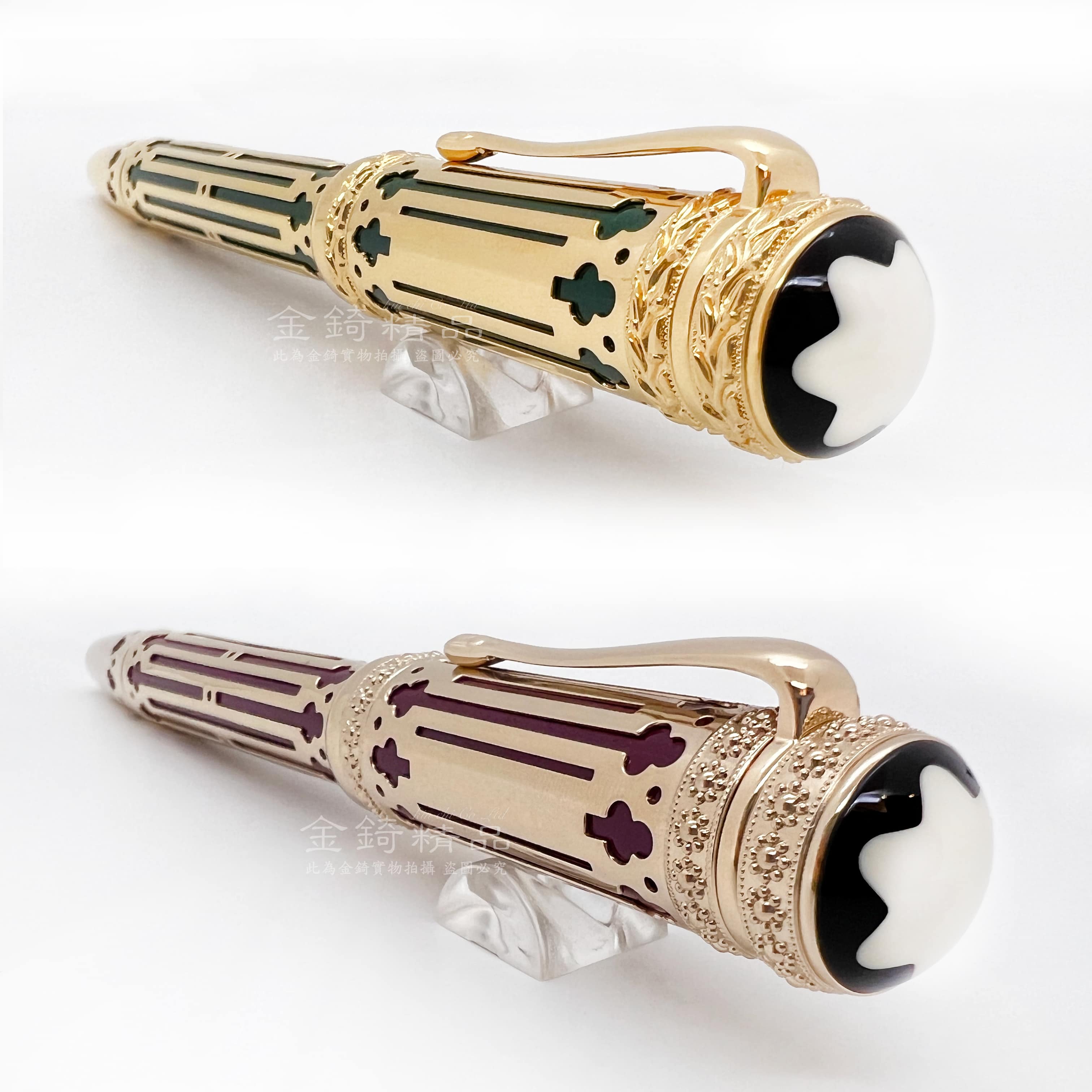 在深綠色筆身上,圍繞著鍍金裝飾的金色月桂冠圖案,極富美感,炫目耀眼。