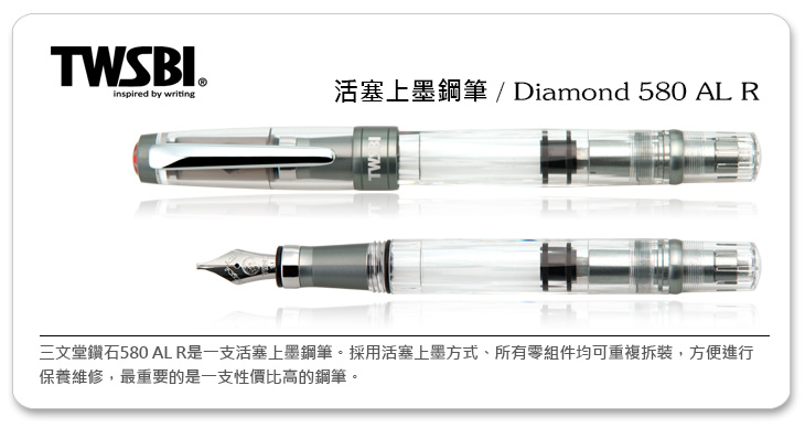 三文堂鑽石580 AL R是一支活塞上墨鋼筆。採用活塞上墨方式,所有零件均可重複拆裝,方便進行保養維修,最重要的是一支性價比高的鋼筆。