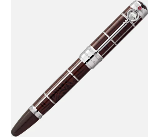 萬寶龍大文豪系列阿瑟.柯南.道爾爵士限量版向家喻戶曉的偵探小說作家致意,這位作家塑造了聞名遐邇的顧問偵探夏洛克.福爾摩斯。作品以棕色珍貴漆面製成,呼應福爾摩斯日常使用的煙斗,該元素亦體現於木質筆蓋和筆身尾部之上。筆蓋與筆身均飾以格紋圖案,呼應了福爾摩斯的外套與倫敦歷史城市地圖掠影。 筆夾靈感源自夏洛克.福爾摩斯使用的放大鏡。筆夾後方飾以一隻獵犬的剪影,採用發光顏料製成,呼應福爾摩斯探案故事系列中的《巴斯克維爾的獵犬(The Hound of the Baskervilles)》。筆蓋圓環上印有阿瑟.柯南.道爾爵士的簽名與《血字的研究(A Study in Scarlet)》的標誌,這是福爾摩斯經辦的第一個案件。筆蓋飾有以珍貴珍珠母貝製成的萬寶龍標誌。手工製作的 Au 750 實心金質筆尖鐫刻阿瑟.柯南.道爾爵士的肖像和夏洛克.福爾摩斯的查案工具放大鏡。